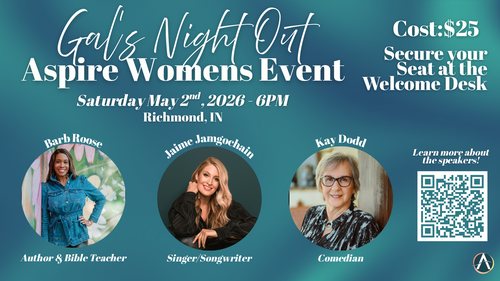 Ladies, you are invited to a fun and encouraging night out together! Join us for the Aspire Women’s Event on Saturday, May 2, 2026 at 6:00 PM in Richmond, IN. This evening will feature inspiring teaching from Barb Roose, music from Jaime Jamgochian, and plenty of laughter with comedian Kay Dodd. It will be a wonderful night of encouragement, worship, and connection with other women.